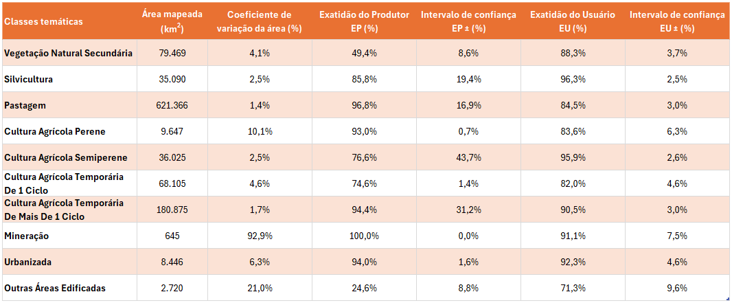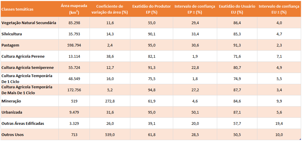 O cálculo de exatidão do mapeamento seguiu o protocolo estabelecido por: Olofsson et al. 2014 (https://doi.org/http://dx.doi.org/10.1016/j.rse.2014.02.015).