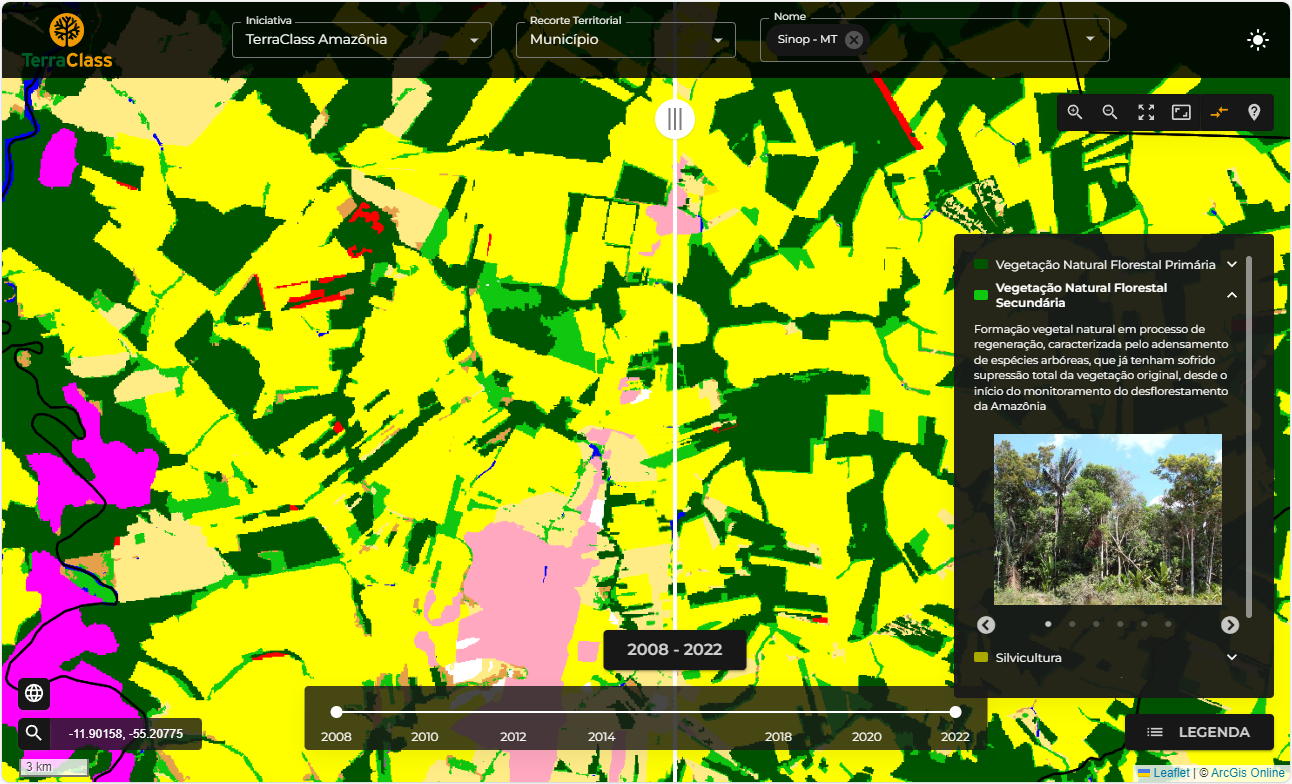 A plataforma do TerraClass disponibiliza aos usuários, um sistema de geoinformações destinado ao acesso e à visualização dos dados de cobertura e uso da terra identificados em áreas desmatadas nos biomas brasileiros. Atualmente estão disponíveis mapeamentos produzidos para os biomas Amazônia e o Cerrado, contendo séries históricas que podem ser visualizadas individualmente ou analisadas de forma integrada no sistema de mapas interativos.