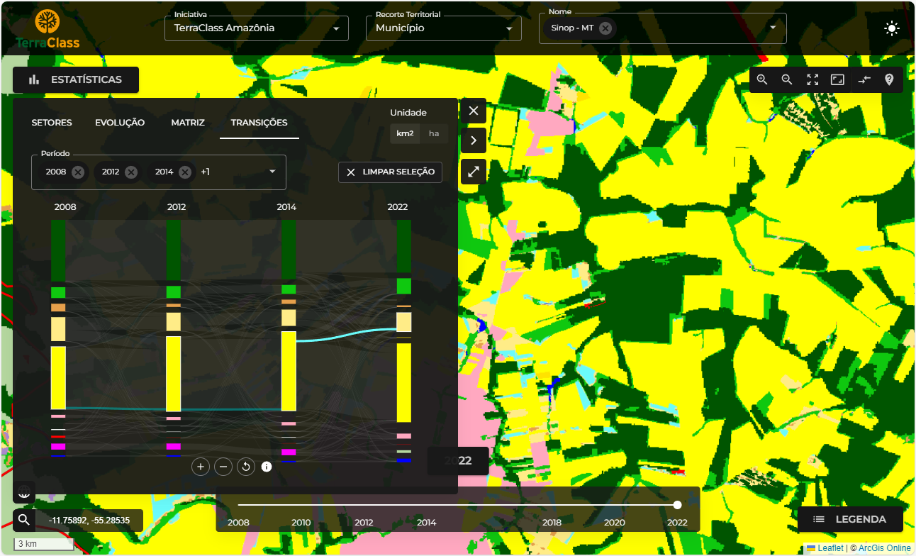 O sistema também oferece serviços geográficos por meio da geração de gráficos, que permitem a análise da dinâmica das classes de cobertura e uso da terra ao longo da série histórica em diferentes recortes geográficos tais como regional, estadual, municipal.